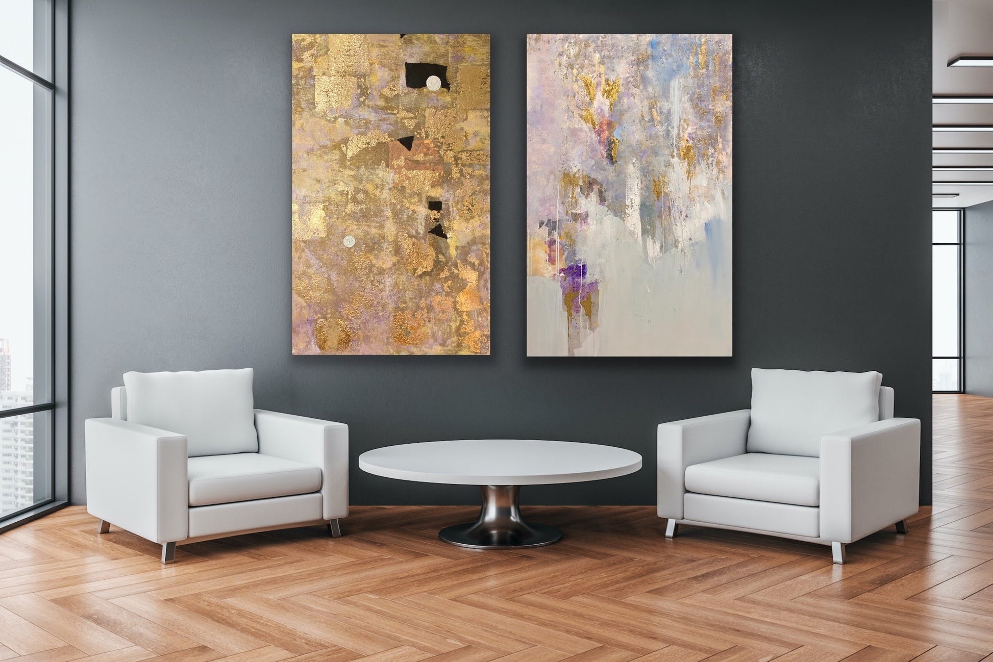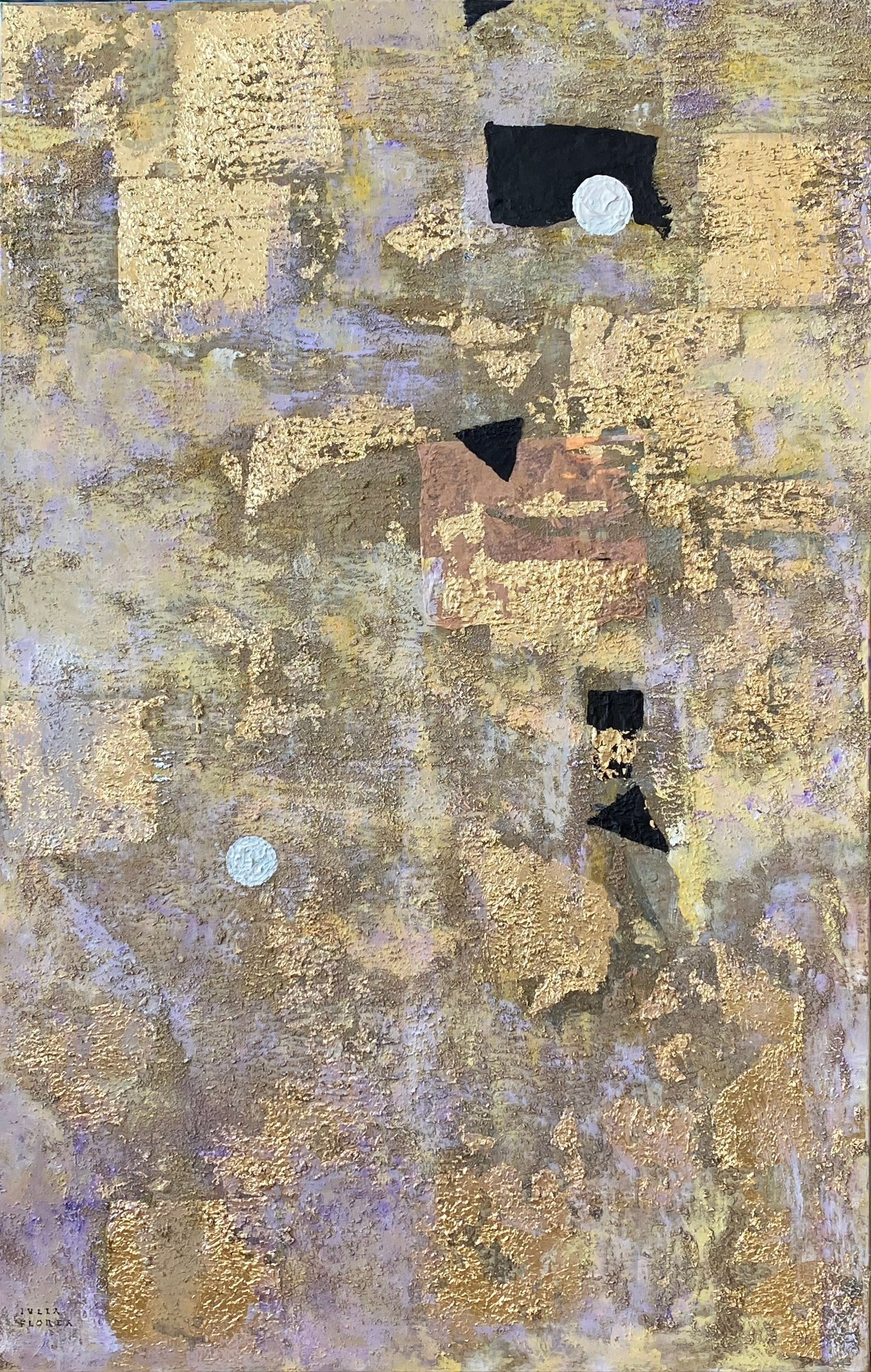 Elevate your space with this stunning abstract painting featuring intricate textures and luxurious gold leaf accents. Evoking feelings of sophistication and elegance, this mixed media piece is perfect for adding a touch of opulence to any room. Elevate your interior design with the timeless beauty of gold.